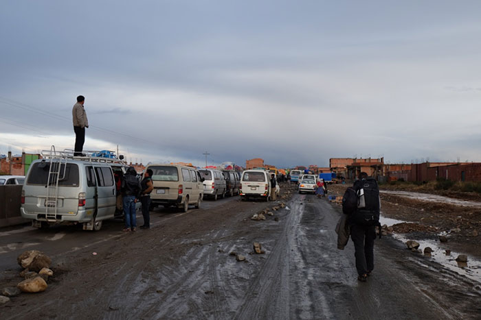 Cogemos un autobus de Copacabana (Lago Titicaca) a La Paz,saliendo a las 13.30 hrs. El trayecto duraría 4 horas (ese mismo día queremos coger el autobús nocturno de las 7 de la tarde que sale de la Paz a Sucre).A mitad de trayecto el autobús se para ,no lo damos más importancia,pero empezamos a ver que alrededor están todos los vehículos también parados,y hay mucha gente andando por la carretera.