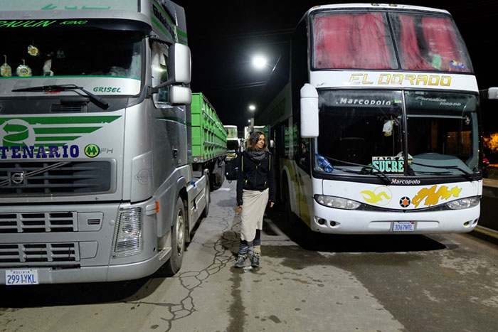 No sabemos que hacer , hay gente que esta cogiendo sus mochilas y yendo a la zona del bloqueo para atravesar esa zona , que esta a 3 horas andando y coger allí un taxi para ir a la siguiente ciudad,que no esta muy cerca precisamente y la otra opción es volver hacia una ciudad que hay detrás a una hora andando,pero son las 4.30 de la mañana y hace un frío tremendo (llevo 2 camisetas térmicas,un jersey , un forro polar,2 pares de calcetines,y una manta alrededor de la cadera,con esto os lo digo todo)…así que creo que vamos a esperar a que salga el sol para andar con menos frío,y allí ya decidiremos…Nos han dicho,no se si será cierto,que el bloqueo puede durar hasta 3 días………….Parece que esta difícil llegar a Sucre!!